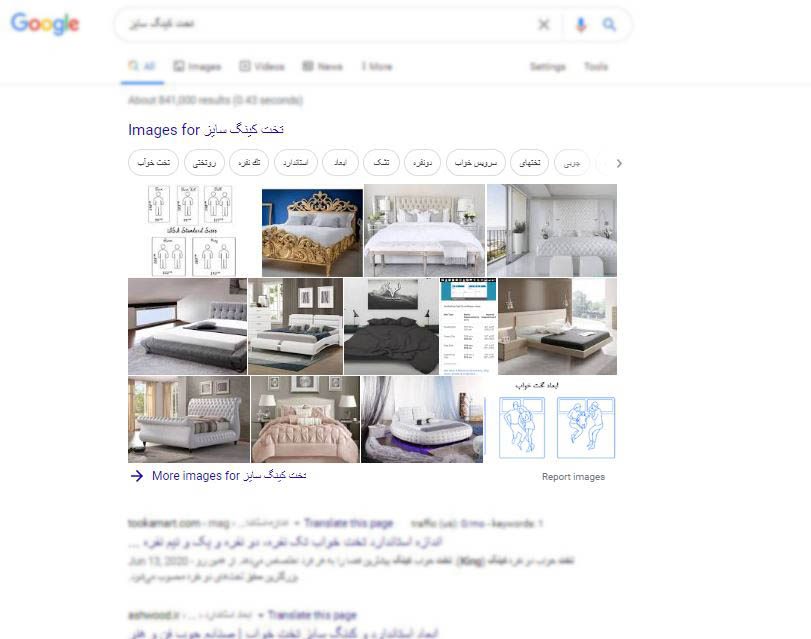 ویژگیهای تصویر مانند Alt tag در واقع جایگزین خوبی برای ترجمه تصاویر به زبان رباتها هستند. هرچه توضیحی که میدهید، به کلمات کلیدی محتوایتان بیشتر مرتبط باشد، شانستان برای دیده شدن در بخش جستجوی تصاویر بالاتر میرود. برای مثال در تصویر زیر بعد از جستجوی کلمه کلیدی تخت کینگ سایز، گوگل در همان ابتدا مجموعهای از تصاویر را پیشنهاد میدهد که با جستجوی شما همخوانی دارند: