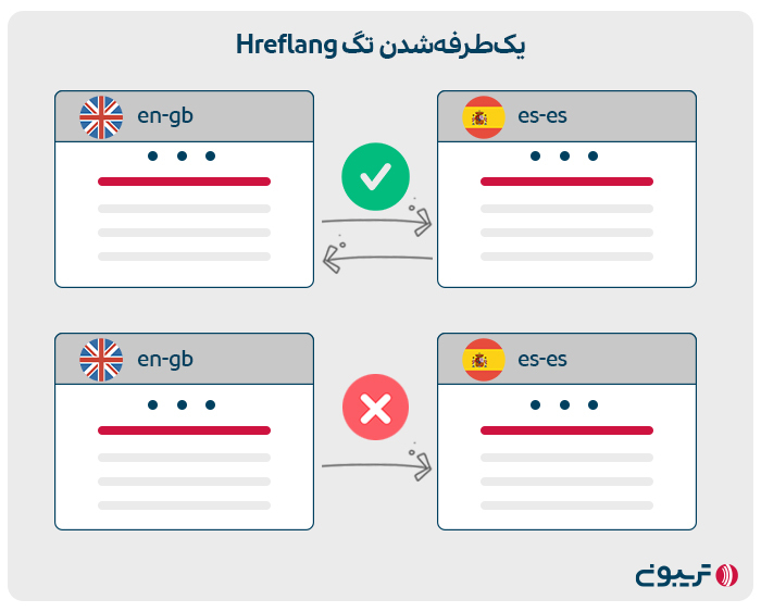 برای جلوگیری از این اشتباه باید مطمئن شوید که نسخههای متفاوت یک صفحه به زبانهای مختلف، همدیگر را در تگ Hreflang لیست کردهاند یا بهاصطلاح به هم لینک شدهاند. در غیر این صورت، ارتباط بین صفحات یکطرفه خواهد شد و گوگل نمیتواند بین صفحات ارتباطی را کشف کند.