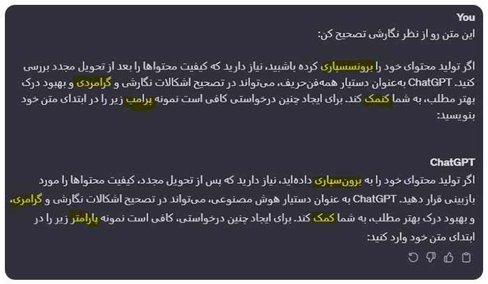 اگر تولید محتوای خود را برون‌سپاری می‌کنید، نیاز دارید که کیفیت محتواها را مجدد بررسی کنید. ChatGPT به‌عنوان دستیار همه‌فن‌حریف، می‌تواند در تصحیح اشکالات نگارشی، گرامری و بهبود درک بهتر مطلب به شما کمک کند. برای ایجاد چنین درخواستی کافی است در ابتدای متن خود بنویسید: «این متن رو از نظر نگارشی تصحیح کن»