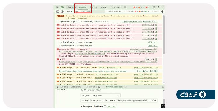 از تب Console، می‌توانید برای بررسی منابع مسدودشده یا خطاهایی که ممکن است بر فرآیند رندر تأثیر بگذارند، استفاده کنید.
