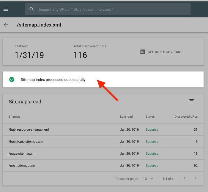 ۲. اگر جمله «Sitemap index processed successfully» را مشاهده میکنید، یعنی گوگل با موفقیت سایتمپ شما را کرال کرده و سایت مپ با موفقیت به سرچ کنسول اضافه شده است.